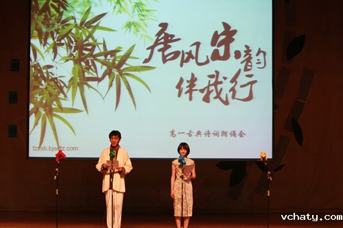 2010年6月8日下午,伟德官方登录入口网址高一年级同学在伟徳国际BV会堂举行“唐风宋韵伴我行”古典诗歌朗诵会。