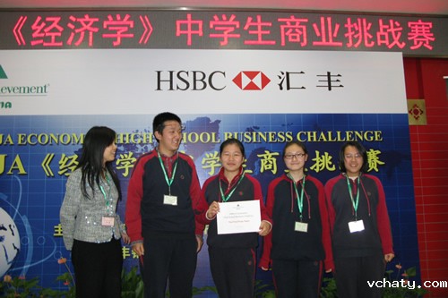 2008年12月13日,在政治组赵敏老师的带领下,我校由高一、高二共11名《企业经营模拟》选修课同学参加了由JA中国青年成就组织举办的“2008 JA《经济学》中学生商业挑战赛”,与来自十四所学校的32个小组对决。高二(1)班丁玄、高二(6)班施彦、高二(4)班金鑫、胡文谷四位同学组成的VISION队表现优异,获得第一名(The First Prize Team)。