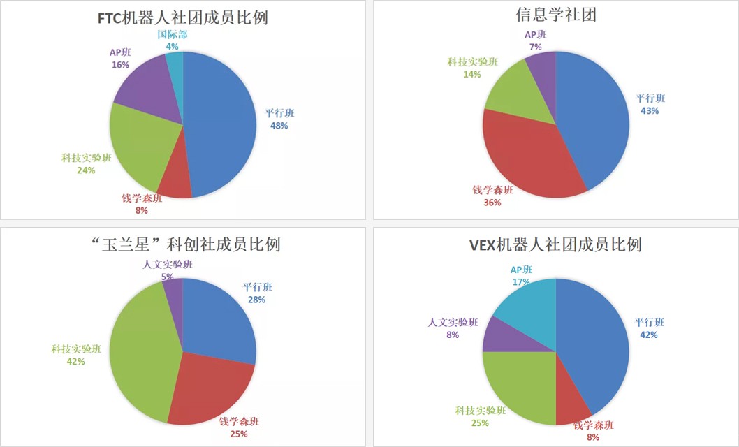 我校科技社团包括“玉兰星”科创社、“FTC机器人社团” “VEX机器人社团”“信息学社团”“模型社”……社团中的同学来自钱学森班、科技实验班、人文实验班、平行班、AP班以及国际部,怀着对科学研究、机器人、信息学共同的爱好,他们走进同一个团队,切磋学习、并肩战斗。现在高一、高二年级在几大科技社团中的成员比例如下:
