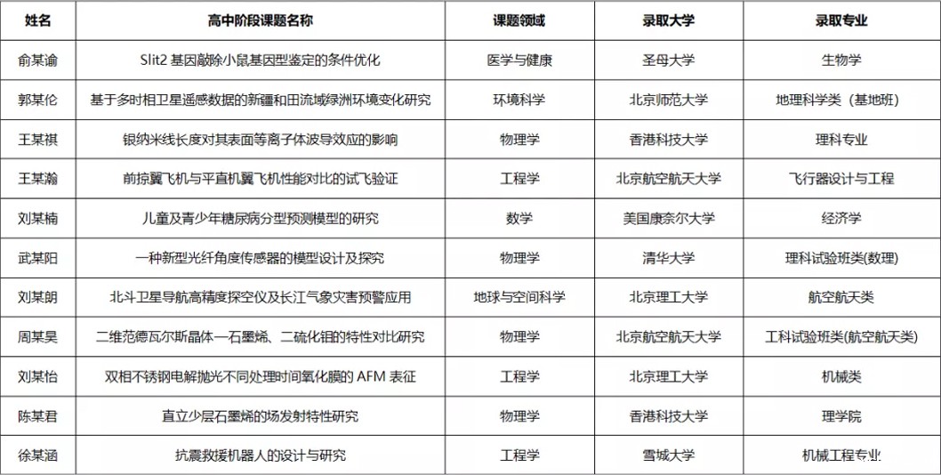 通过对2014-2019届科技社团的成员追踪发现,其中很多同学选择的大学专业与他们在高中阶段完成的课题方向高度一致(部分同学录取大学及专业见下表)。他们不仅仅停留在满足个人的兴趣上,而且将科学研究、技术发明作为自己一生的事业和追求。他们将带着附中科技人的烙印,发展成为一名真正的科技工作者,回报祖国和社会。
