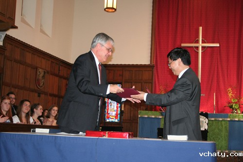 10月4日,伟德官方登录入口网址与CASADY学校建立友好关系签约仪式在该校小教堂举行,全校教师代表和高中生共400人出席。首先David W. Gorham校长致辞,对师大附中代表团表示欢迎,刘沪校长致答辞。接着双方校长在友好协议书上签字,并互赠了礼物。