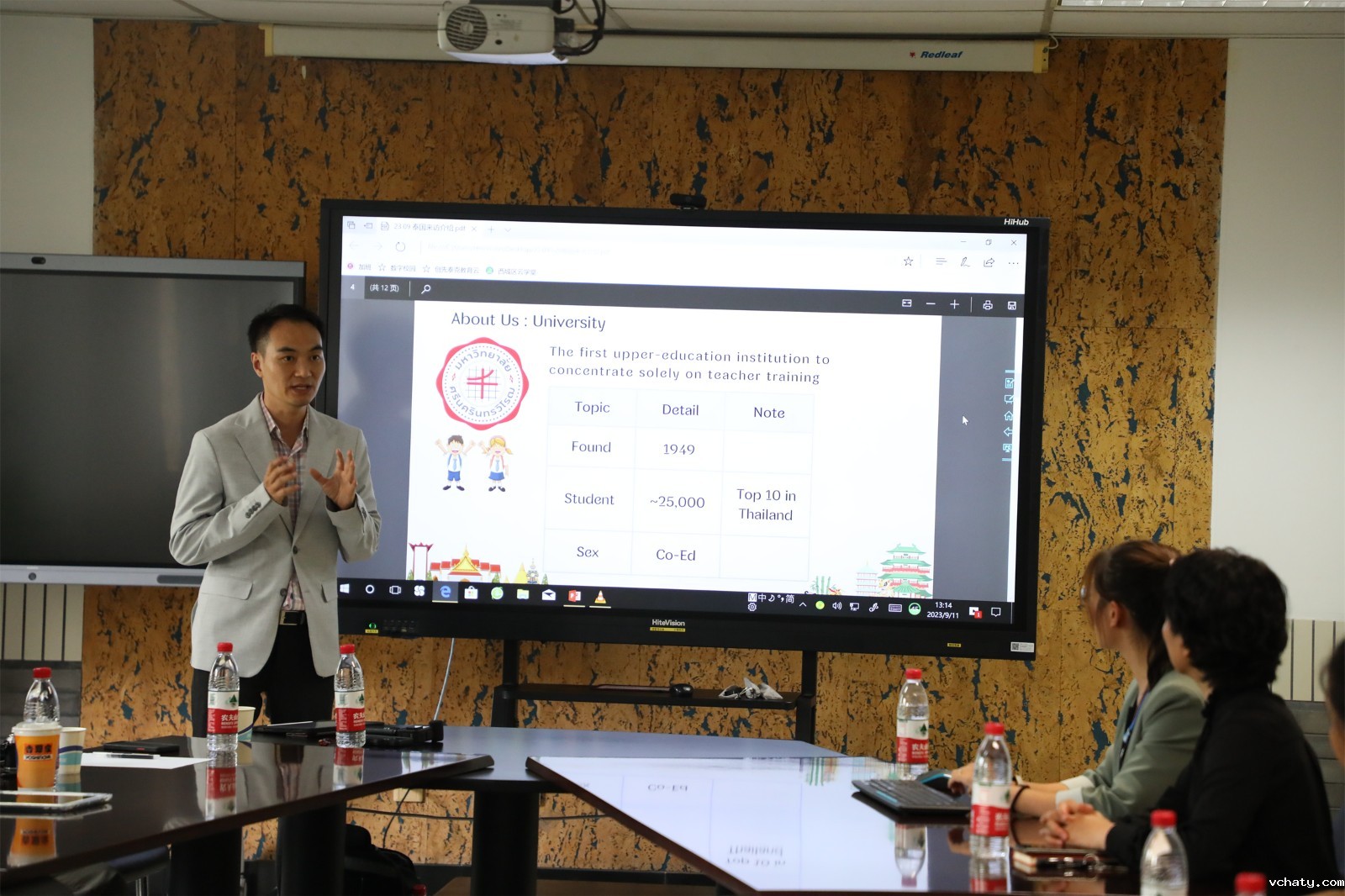 然后,本次活动的组织者Kolitawong先生向学校介绍了诗纳卡宁威洛大学和附属中学的基本情况,还针对泰国学生的学习目标和考试科目要求做了详细介绍。