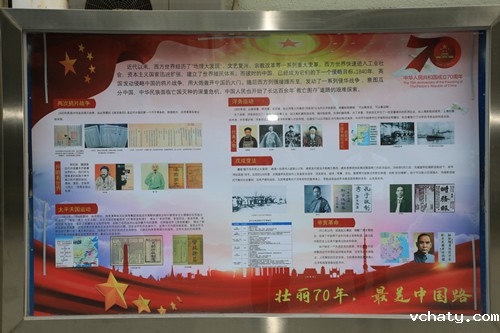 由梁原草副校长策划、学生成长指导中心的老师们收集材料、组织筹办的宣传橱窗,对一百多年来中国人民探索拯救民族危亡和探索民族复兴道路的艰难历程和壮丽图景进行了清晰展示。学生们通过橱窗的展示了解了70年来共和国由站起来、富起来到强起来的复兴之路。
