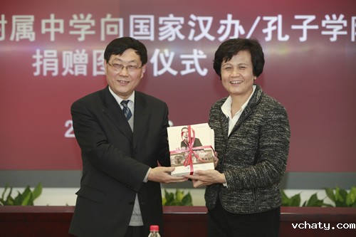 虽然整个活动持续近三小时,但讲堂内气氛热烈,掌声不断。许琳主任对汇报给予了极高的评价。她说,有这样的老师存在,表明中国的教育是有希望的。老师们美丽的心灵、优美的语言、给人启迪的智慧,让她很想时光倒流,重新上一次中学。随后,许琳主任授予了我校“汉语国际推广中小学基地”的称号,双方互赠了各具特色的书籍。在活泼的氛围和真诚的掌声中,汇报活动圆满落幕。