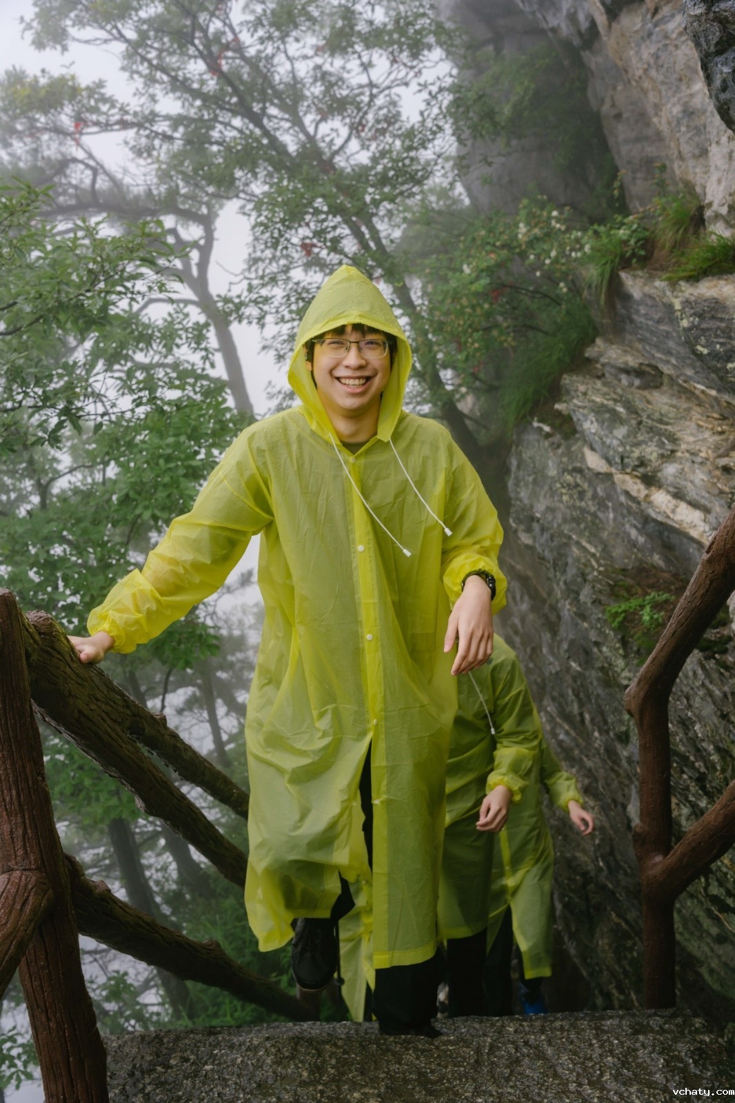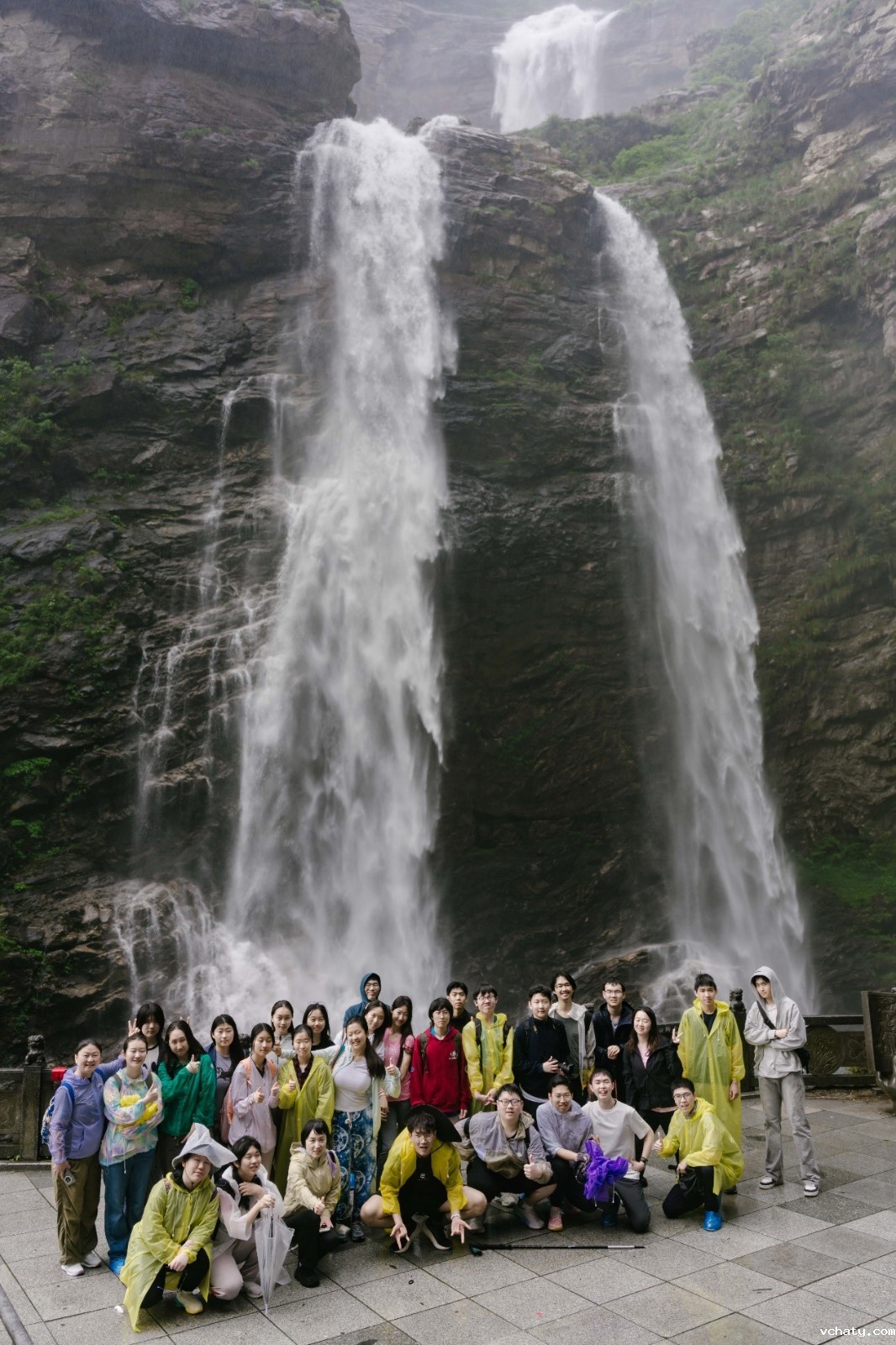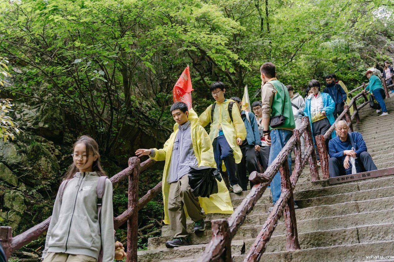 午饭后,同学们兵分两路,正式向三叠泉进发。雨中的庐山被浓雾裹挟,十米之外,人影便消融在乳白色的混沌里,再现 “不识庐山真面目,只缘身在此山中”的情境。同学们踩着湿滑的石阶,如云端漫步般一步步向三叠泉迈进。临近谷底,雾幕逐渐被撕开,雨后的三叠泉气势壮阔,银白的瀑流自高空飞泻,在嶙峋的崖壁上三次折转,如白龙腾跃,坠入深潭,激起雷鸣般的轰响。水雾漫天飞扬,打湿了同学们的衣襟和脸颊,这独特的旅行经历让同学们兴致盎然,大家脸上都洋溢着满足的笑容,为这难得一见的景观喝彩。从三叠泉下山的路途比想象中更艰难。路程遥远,石阶陡峭湿滑,有些同学的腿已经开始酸软发抖。大学互相搀扶,彼此支持。落在队伍最后的同学在老师的陪伴下,坚持前行,最终抵达山脚。虽然大家都感觉疲累,但脸上是掩不住的成就感。壮美的庐山胜景和同学们坚持不懈的意志,成为本次旅途中最美的记忆。