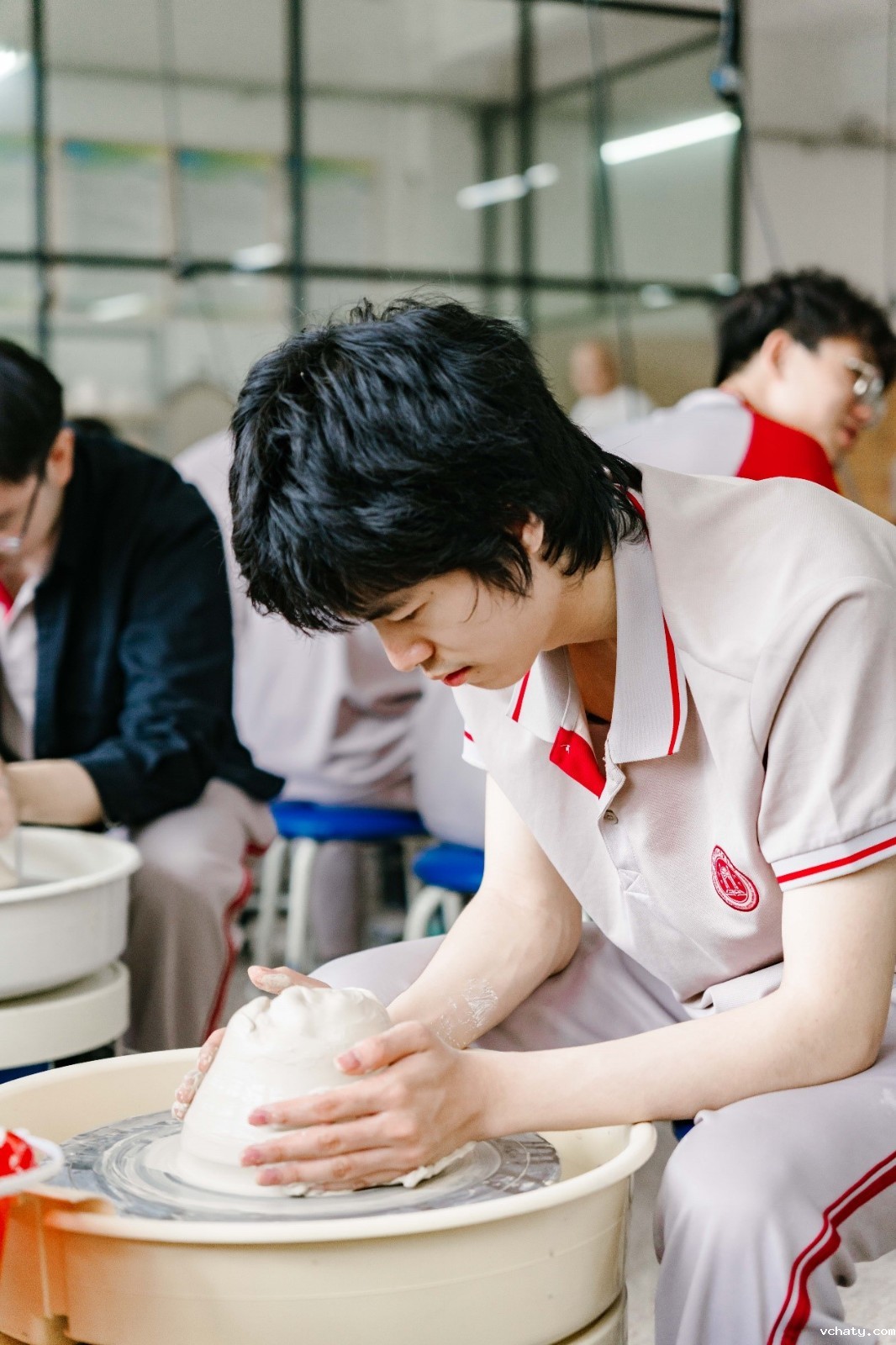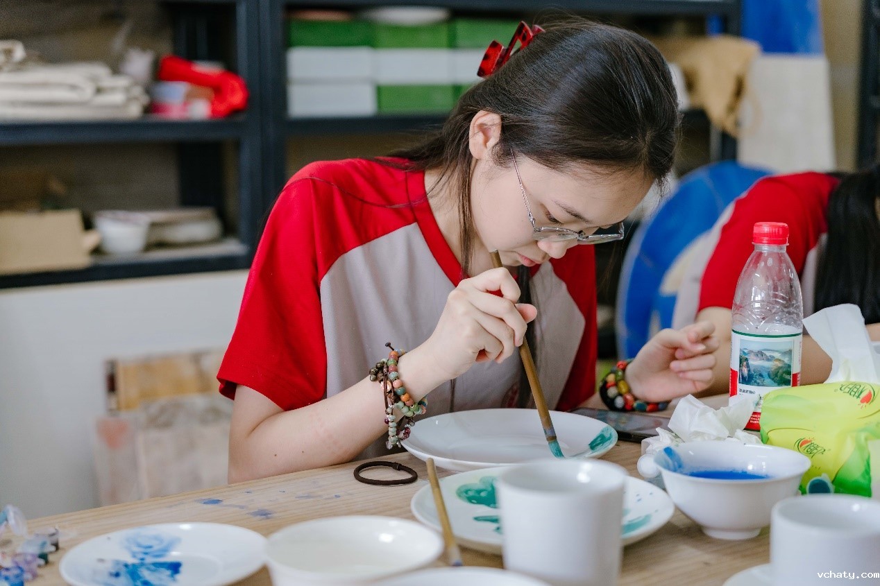 5月22日上午,同学们来到景德镇陶瓷大学——中国唯一一所以陶瓷为特色的本科高校。同学们分成两组,在陶瓷大学的教授和留学生的指导下,亲自体验拉坯与釉上彩绘艺术。随着陶轮的旋转,一个个独具艺术魅力的陶器在同学们的手中慢慢塑造出来;在釉上彩绘的课堂中,同学们发挥创意,用手中的毛笔和特殊的颜料,在素坯上绘制出独一无二的作品。
