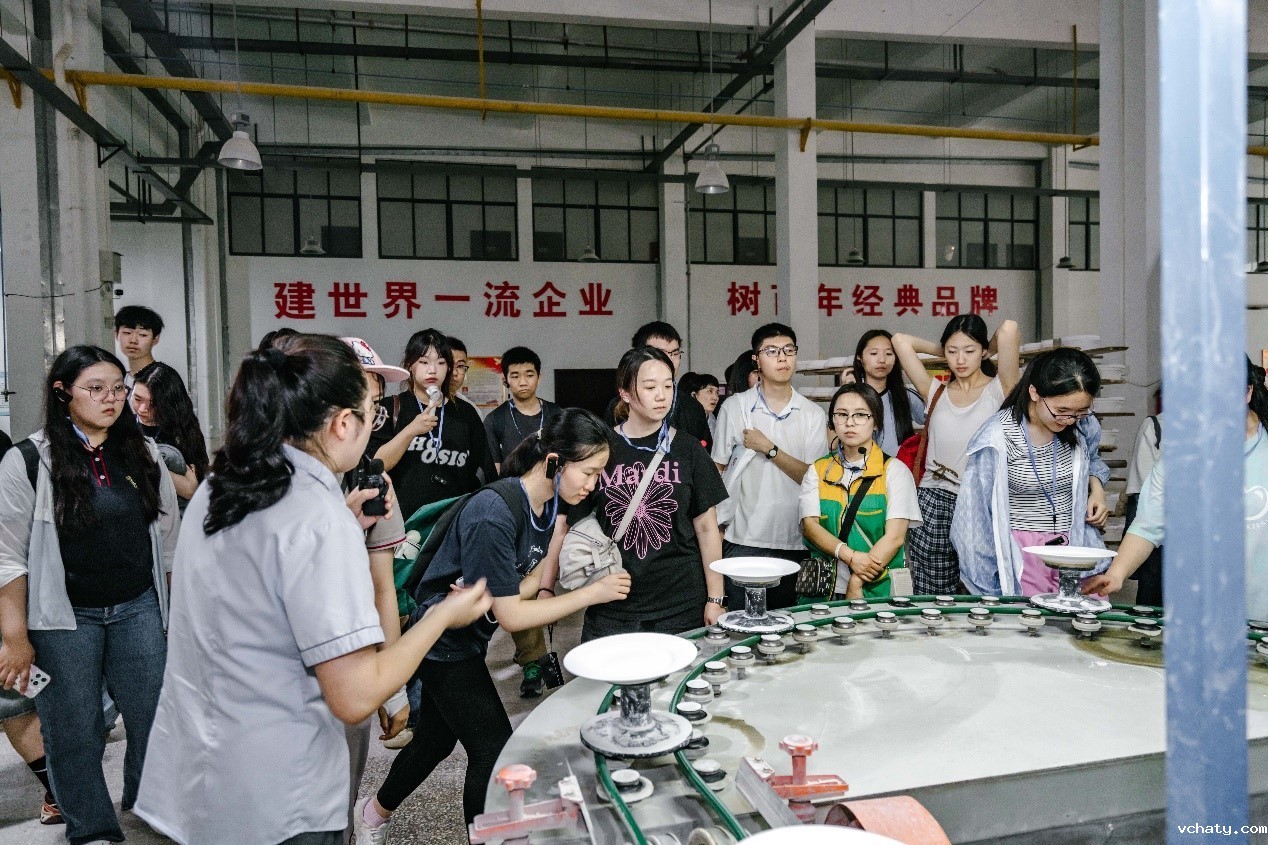 下午同学们来到红叶国瓷厂,观摩现代陶瓷的工厂化制作工艺。全自动生产线上,机械臂在几秒内将泥土变成素坯,再将素坯送到匠人手中绘制花纹,然后传送到窑中进行烧制。先进的现代制瓷技术极大地提高了陶瓷的生产效率,满足了国民生产生活中对陶瓷的需要。国瓷厂的展厅中陈列着从献礼建国七十周年的礼品到日常使用的杯盘碗碟的各种陶瓷用品,种类繁多、质地精美,让同学们深刻感受到陶瓷在现实生活中的广泛应用。
