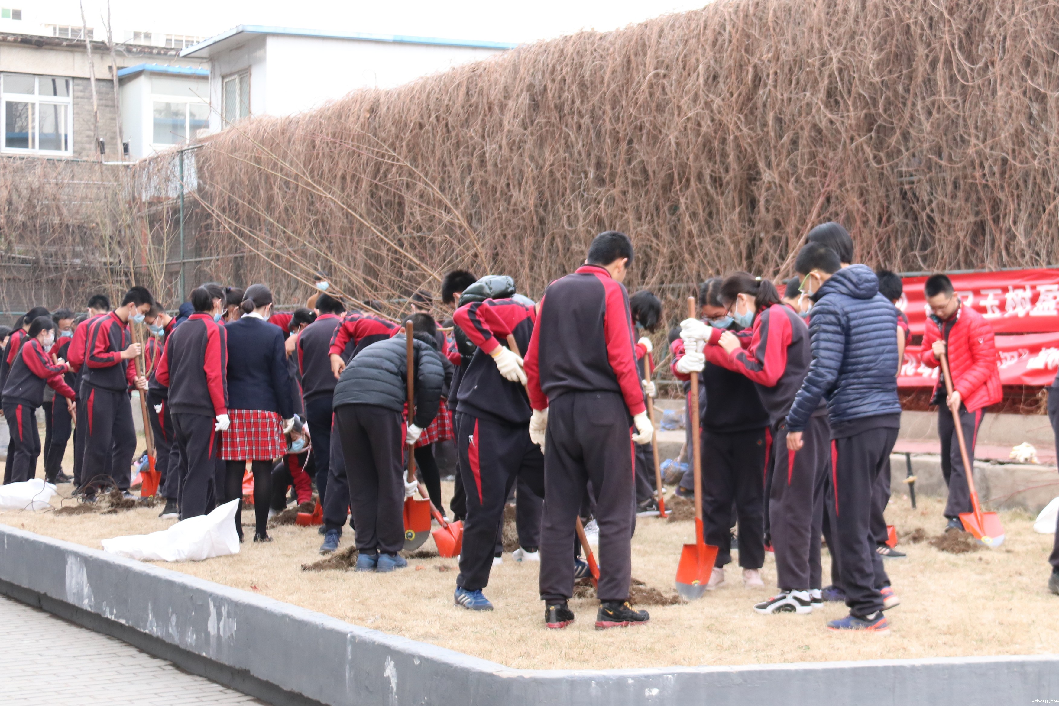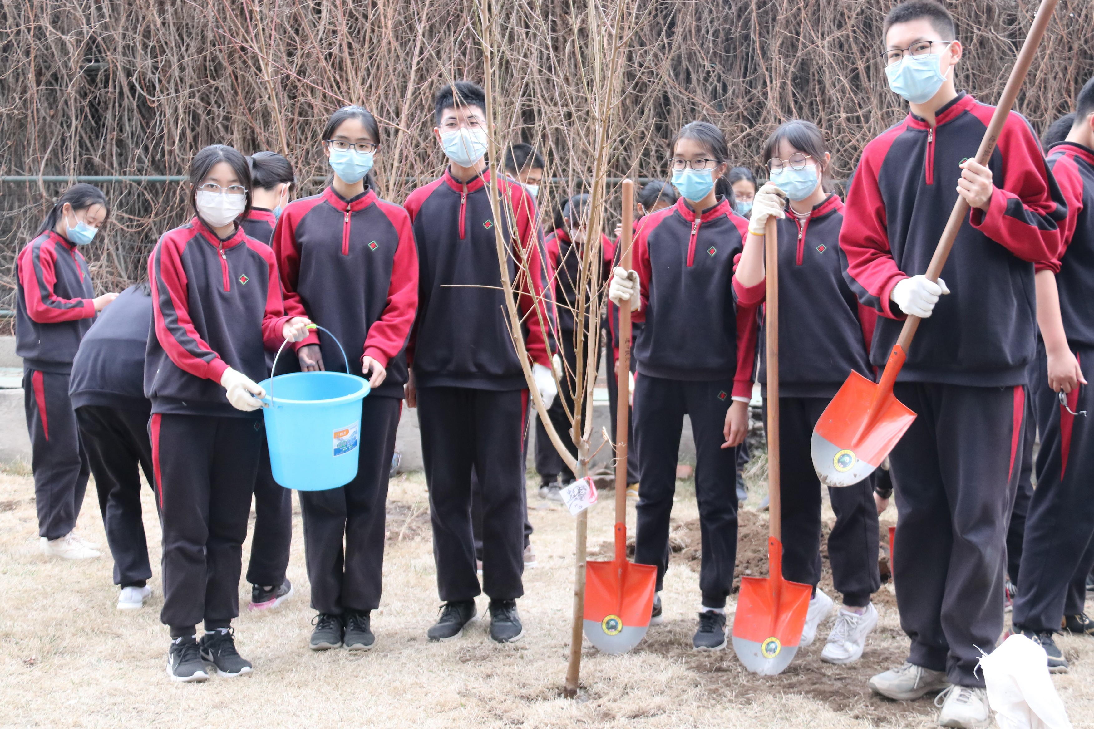 在认真聆听了生物老师的指导后,同学们分成十个小组,用铁铲翻开泥土,拣走硬石,挖出树坑,植入树苗,填满坑隙,踏平泥面,浇足甘泉,系牢名牌,大功告成!