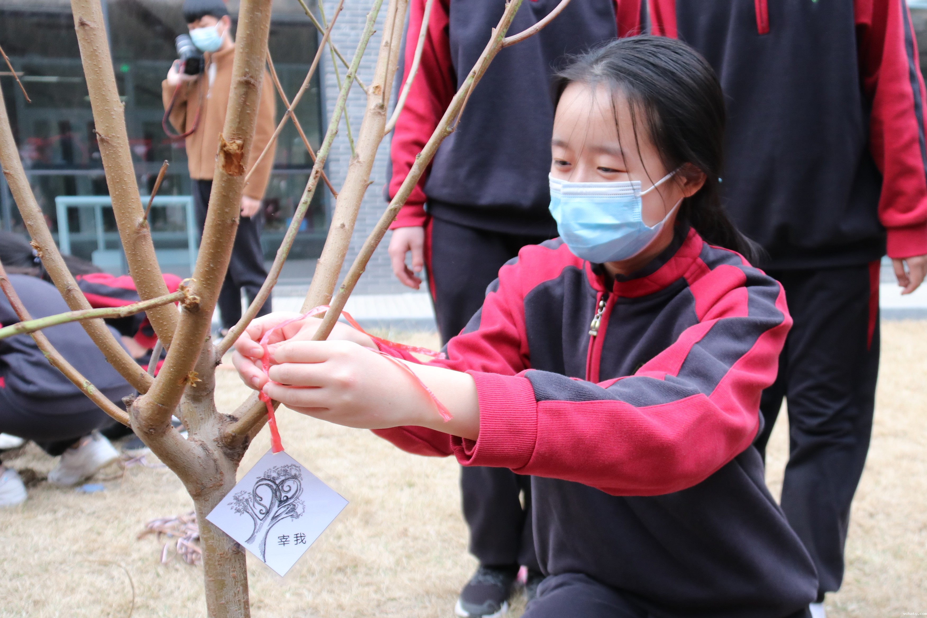 在给桃树系名牌的环节,各组分别举行了独具特色的仪式。有的鼓掌,有的唱歌……颜渊、闵子骞、冉伯牛、仲弓、宰我、子贡、冉有、季路、子游、子夏,仿佛就此重焕生命的活力。于此获得新生的,也不再仅仅是十棵桃树了,而是同学们对古代先贤的敬慕和对中华传统文化的热爱。桃李春风,玉树盈阶,这是同学们对附中,也是对自己的美好祝愿。