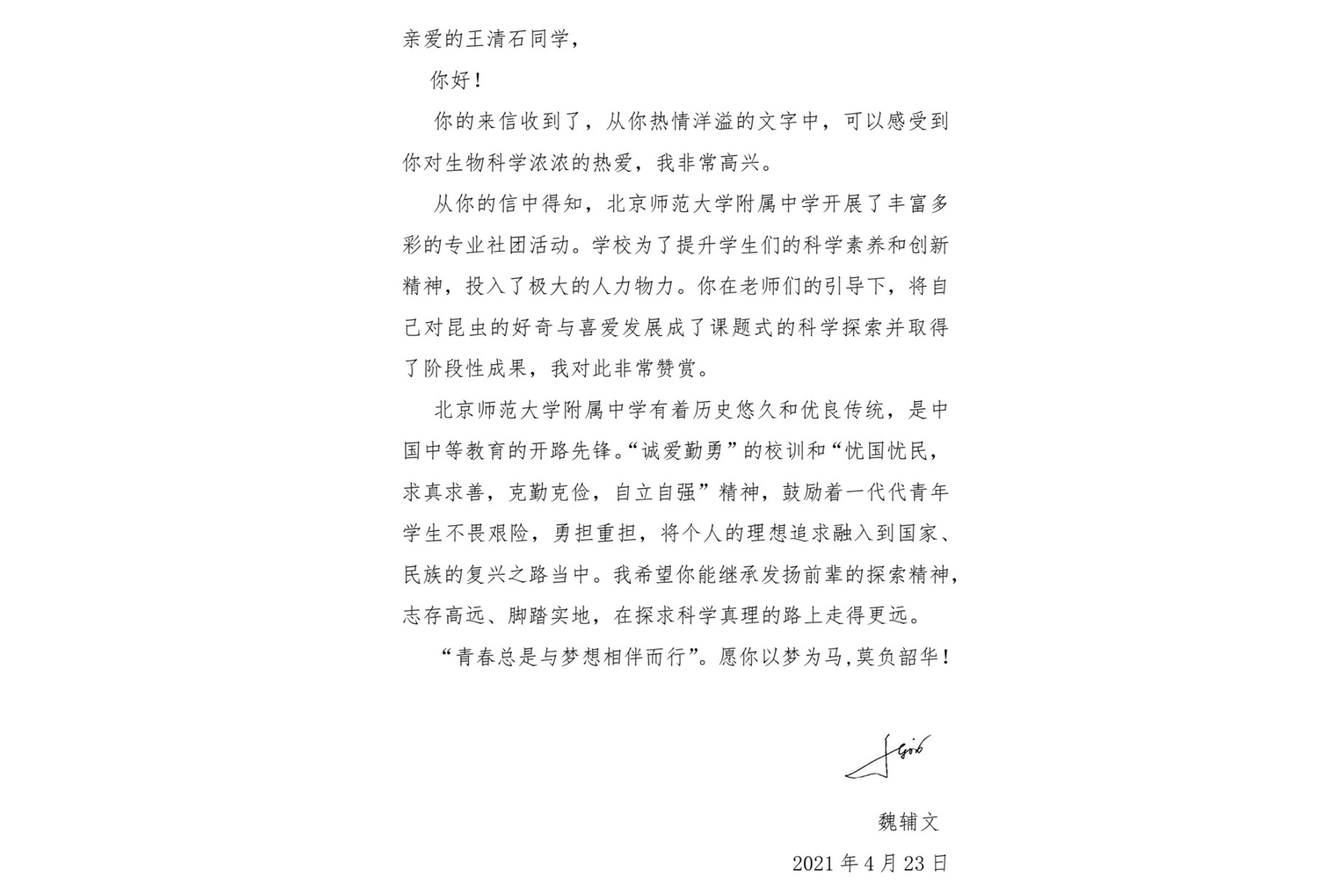 活动中,工作室的种子教师代表刘铭玉和我校生物学科优秀学生代表王清石分别通过示范课说课、汇报和书信的形式与魏辅文院士进行了沟通和交流。魏院士为学生书写了回信,并肯定了科学思想方法项目在科学理念方面取得的成绩,认为项目对于青少年从事科研和创新工作的意义非常重大,值得在生态观念的培养等多方面进行有益探索。