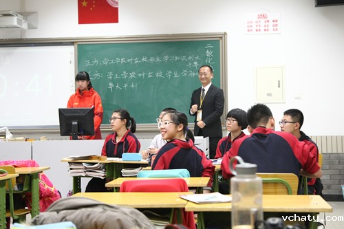 王莉萍校长、徐兰主任出席了在接待室举办的欢迎仪式。王莉萍校长和张添唐校长分别介绍了各自学校的现状和发展历程之后,王校长回答了台南一中学生对我校的钱学森班、文科实验班、国际班课程设置的问题,并对他们提出的相关建议表示赞赏和感谢。