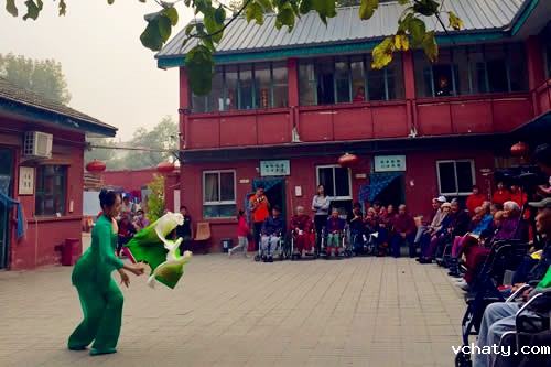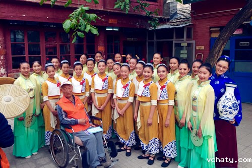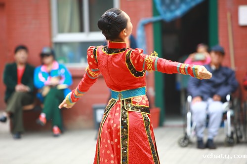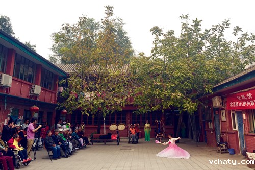 颐寿轩敬老院坐落在一条悠长的胡同里,是湖南会馆的旧址。看见同学们来了,正在远离晒太阳的爷爷奶奶们兴奋地拍起了手,其他的老人们也陆陆续续地走到或坐着轮椅被推到了院里。没有灯光,没有地毯,只有敬老院内这一个大小适中的院子。换上服装和舞鞋,同学们在这里开始了表演。