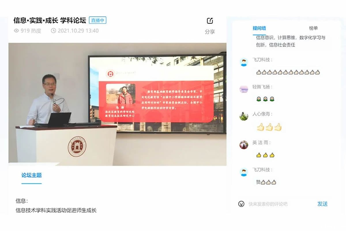 在现场交流与研讨环节,老师们针对两节课的设计、实施等方面展开了热烈的讨论。虽然因为疫情原因,外校教师无法到现场,但是数据显示,观看直播的浏览峰值将近11万。在直播平台,全国各地的同仁为研究课和组长发言点赞留言,踊跃提问,并积极发表观点,对本次活动给予了高度评价。各组安排专人关注网上提问,在现场代为转达,老师们交流研讨。这种形式打破了屏幕的“壁垒”,使线上线下融为一体,保障了交流研讨的良好效果。