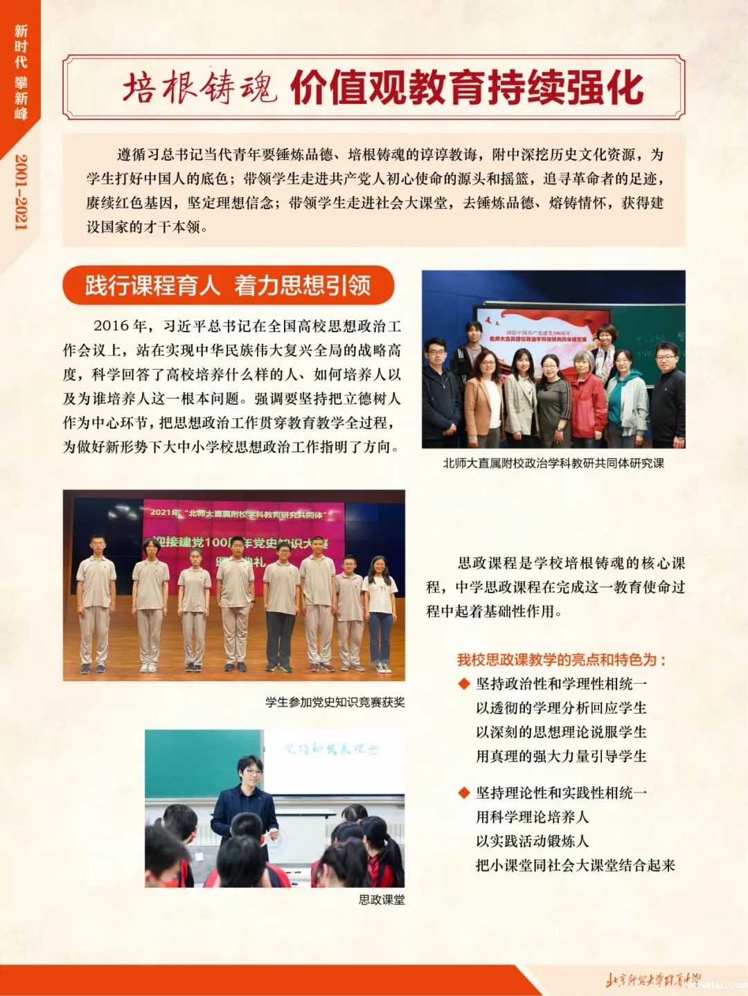 在北京师范大学的引领下,附中进行了一系列改革探索,首倡全人格教育,率先试行“三三”学制,率先实行男女同校、实验文理分科,始终走在全国中学的前列,发挥着开路先锋的作用。