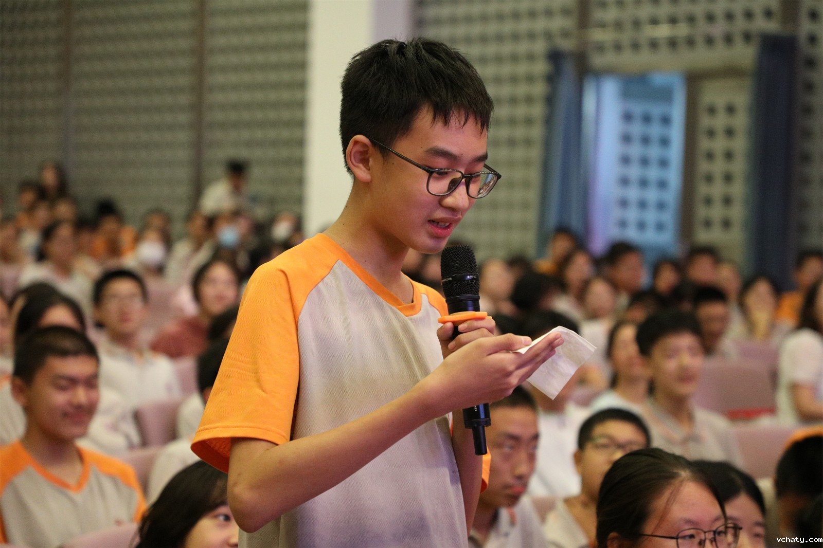 在交流互动环节,同学们踊跃举手提问。钱永刚教授展现了自己风趣健谈的一面,亲切地向同学们分享了自己的成长经历与家庭生活。他提到,父母并未每天刻意过问他的学习情况,但却着力培养他爱读书、独立思考的习惯,这让他受益匪浅。钱永刚教授鼓励同学们多读书,丰富自己的内核。此外,钱永刚教授还讲到,父母对他最重要的教育是爱国教育,在一切的场合、一切的平台,父母始终对他强调的是“爱国”二字。而这,也是钱永刚教授对附中学子最想说的两个字。