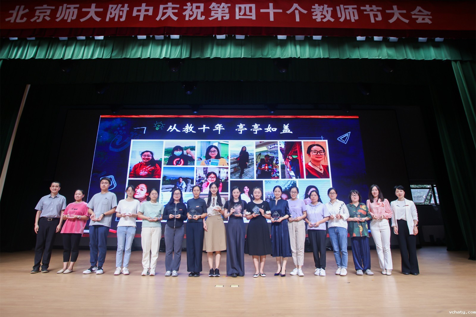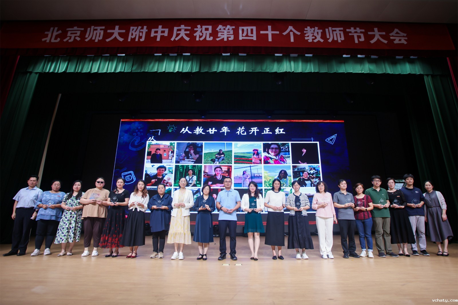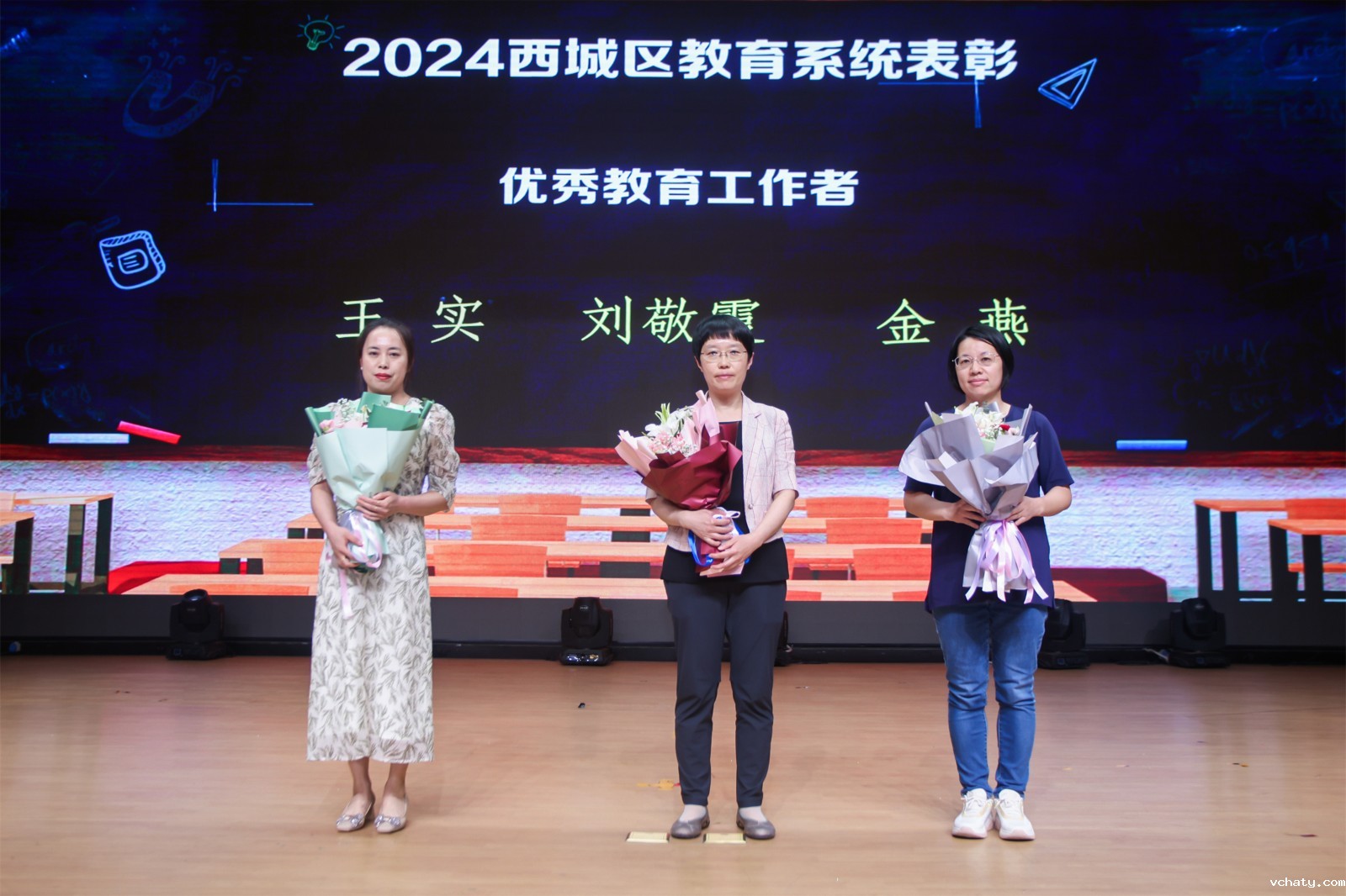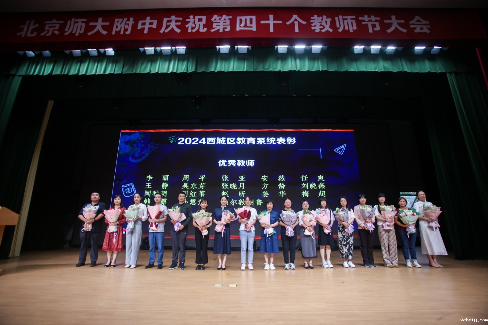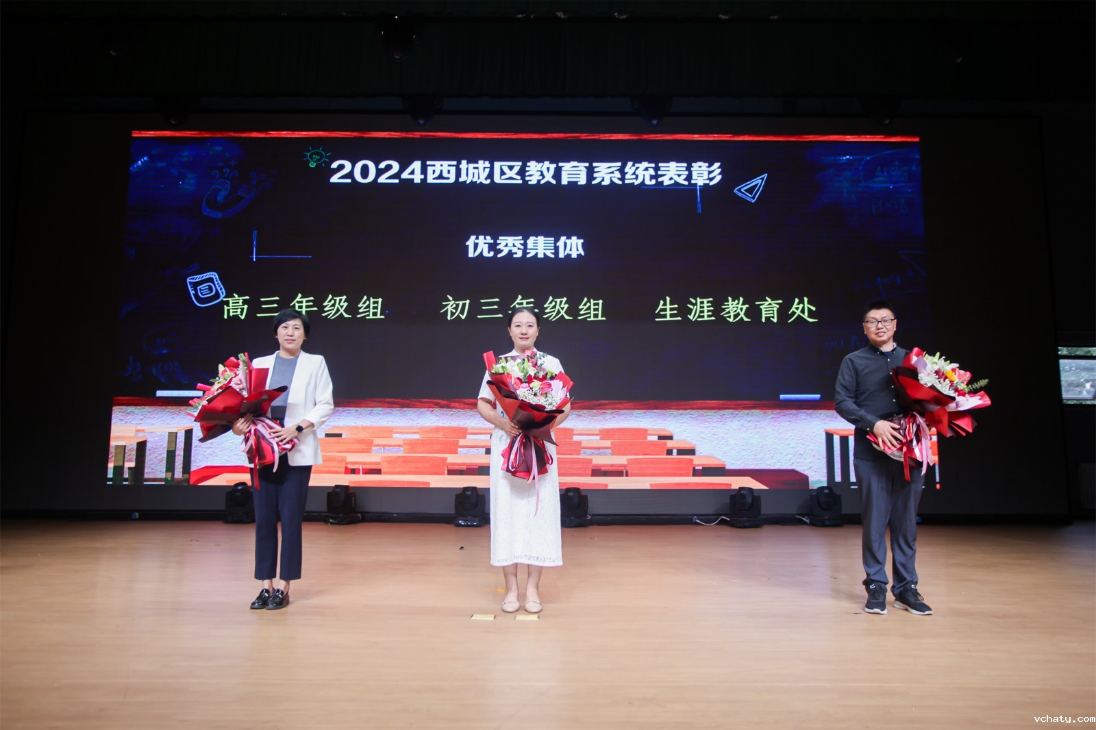 会上对荣获全国、北京市及西城区教育系统的优秀集体、优秀教师、优秀教育工作者和优秀班主任的教职工进行表彰。学生代表为获得荣誉称号的教职工献上了鲜花和掌声,向他们表示最崇高的敬意和祝福。