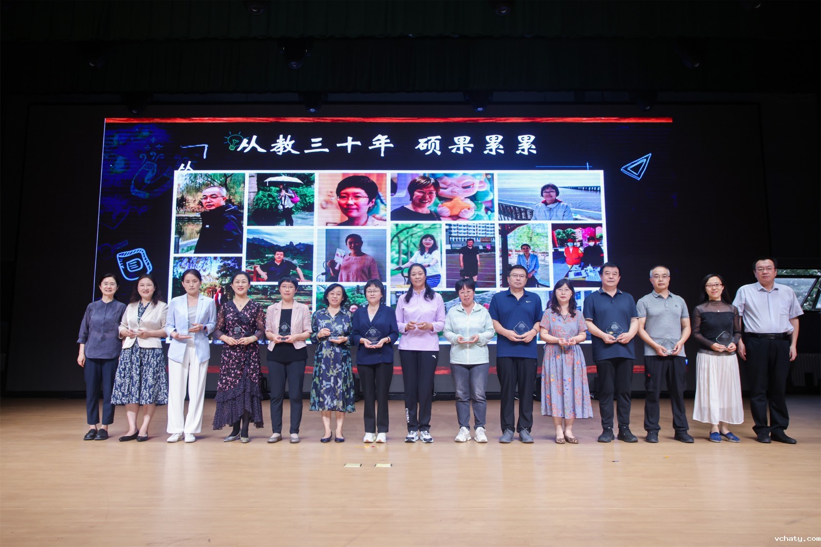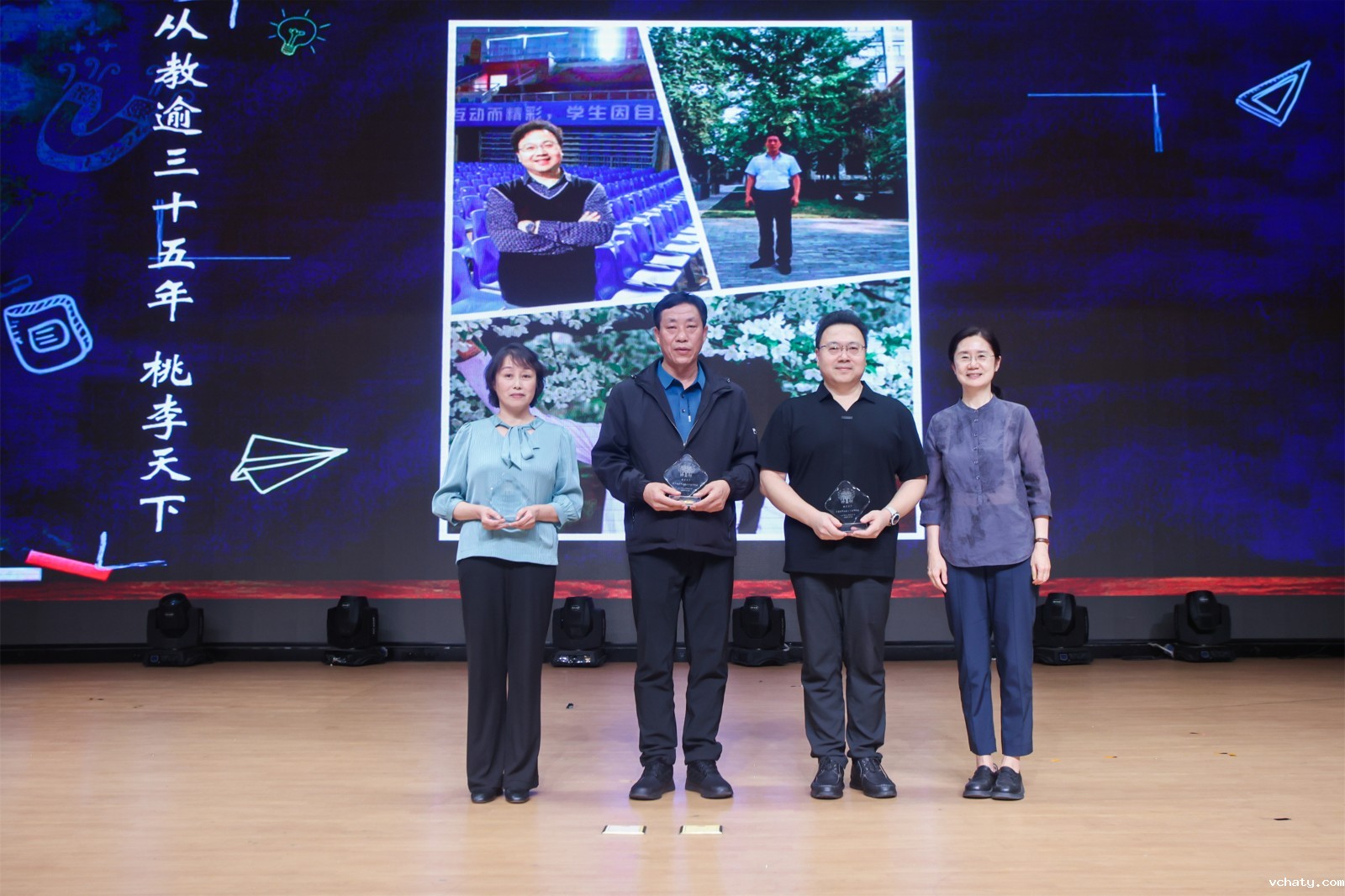 庆祝大会上,学校为从教十年、二十年、三十年、逾三十五年的教师分别颁发了“亭亭如盖”、“花开正红”、“硕果累累”、“桃李天下”纪念章。