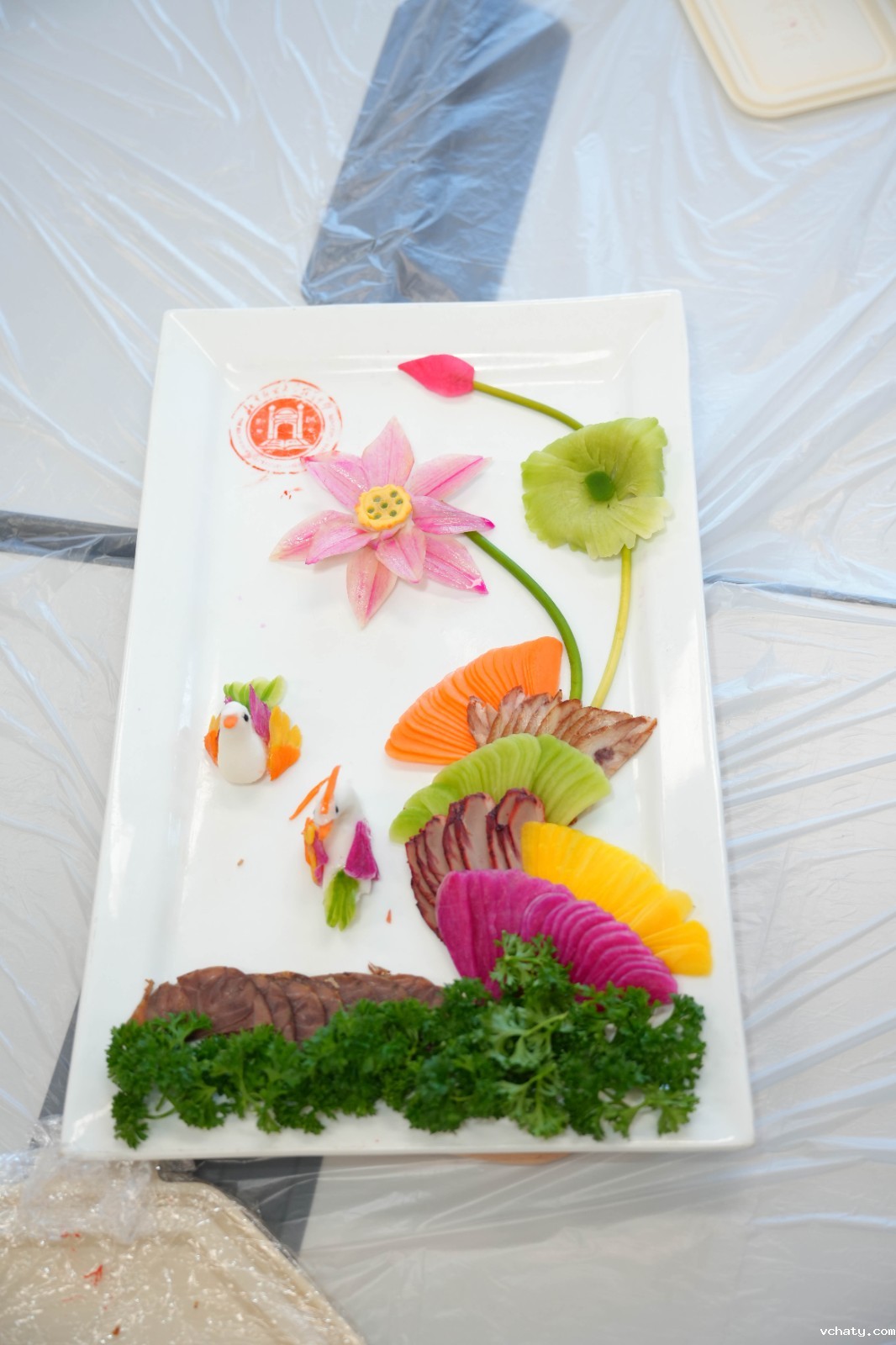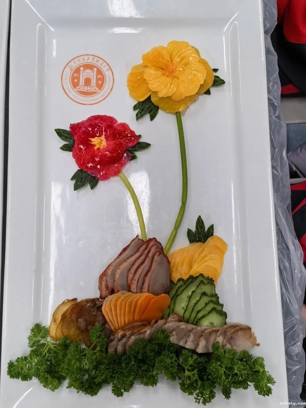 到了动手实践的环节,同学们抖开桌布、分发手套,拿起薄厚均匀、大小适中的切片食材,在厨师们的耐心指导下,同学们巧妙运用卫青萝卜、胡萝卜、黄色胡萝卜、心里美萝卜、酱牛肉、酱肘子、叉烧鸭脯等多种原料,通过精心拼插,堆砌出画作中栩栩如生的假山,为整个拼盘增添了生动的层次感与立体感。