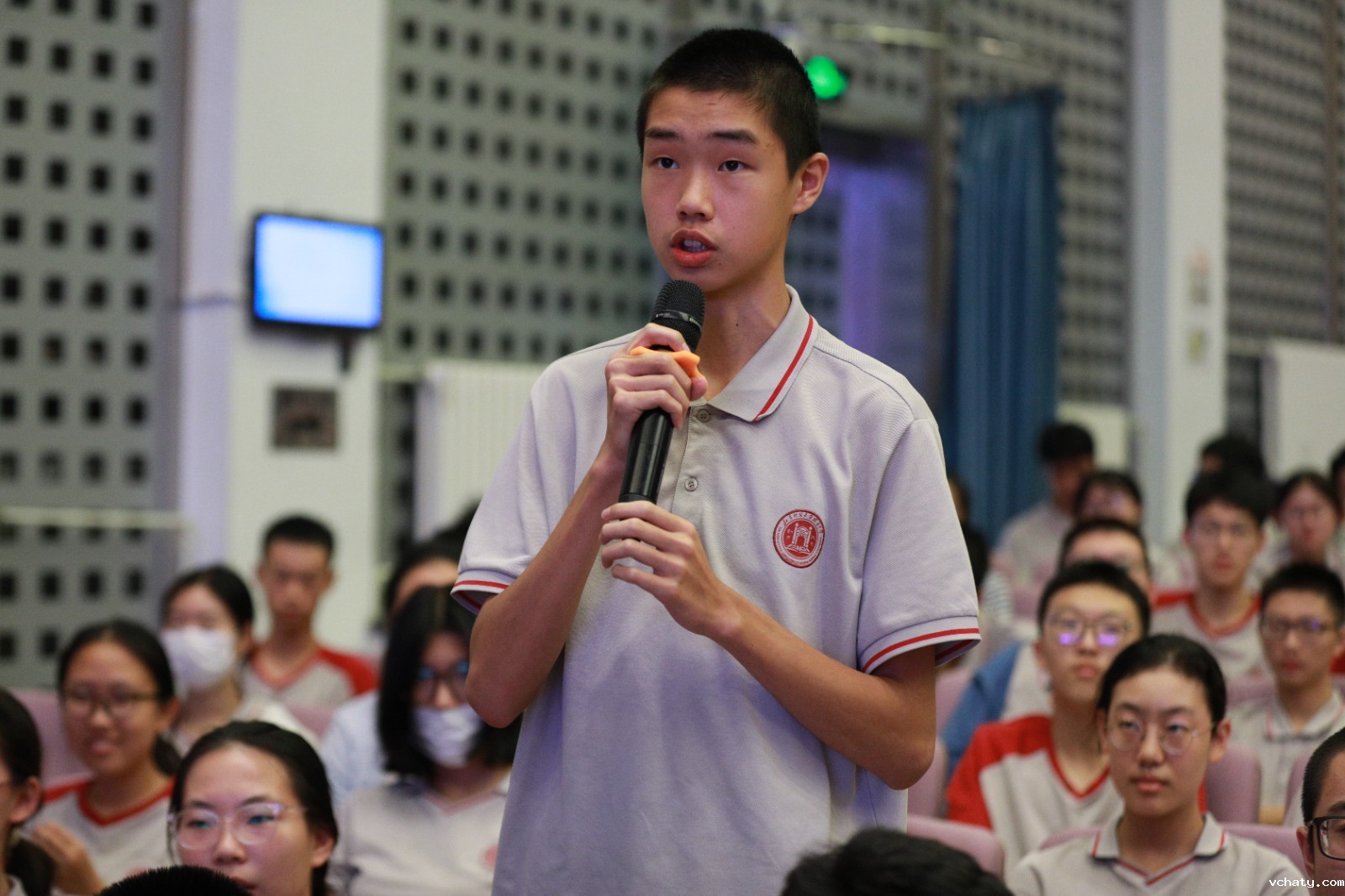 随后顾吉环大校详细回应了同学关于钱老“三次激动”的问题。他说钱老在接受“人民科学家”称号时说自己并不激动,“我这辈子已经有了三次非常激动的时刻”。第一次激动是 1955年和恩师告别时,恩师说“你现在在学术上已经超过了我”;第二次是建国十年的时候成为中国共产党党员;第三次激动,是钱老读了《史来贺传》得知自己作为共产党员的优秀代表,和劳动人民中最先进的同志联系在了一起。钱学森的崇高格局在这“三次激动”中展现得淋漓尽致。这也让附中学子深刻体会到了钱学森学长为学术、为组织、为人民,唯独不为自己个人得失而激动的高尚情怀。