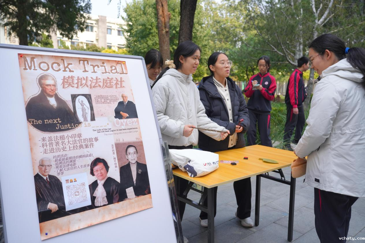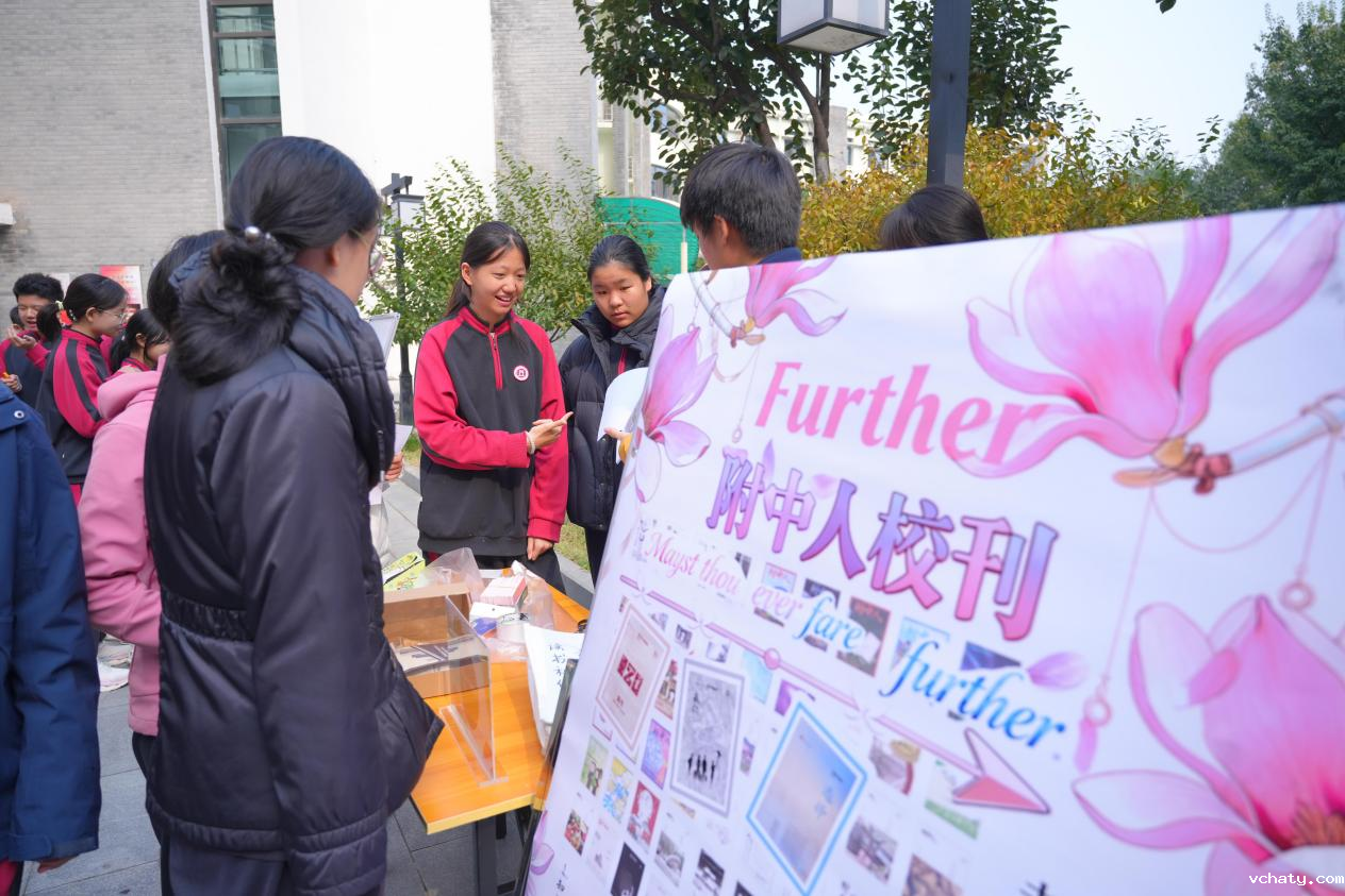 书画展区墨香袅袅,社员挥毫间勾勒出兰亭雅意;棋类社的对弈区落子无声,方寸棋盘演绎着智慧交锋;模拟法庭社的法槌声在校园回响,展板上著名大法官的传奇经历让同学们对法治与公平产生了新的思考;星火思辨社的灵感墙化作思想原野,五彩便签承载着少年们对世界的哲思遐想;校史研究社的时光长廊里,泛黄照片与鲜活讲述交织,让百廿薪火在新时代灼灼生辉。附中人further杂志社展示着往期的杂志成品,这些凝结着附中学子思想与智慧的结晶,表达着“附中人”独特的的青春思考与人生态度。