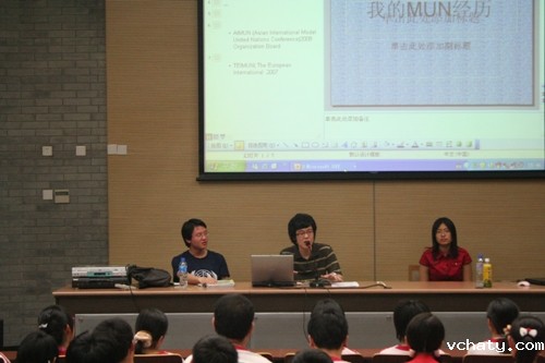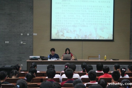 此次“模联”活动中,北京大学“全国中学生模拟联合国大会”组委会的工作人员 孙露和冯宇辰向大家介绍了“模拟联合国大会”的组织结构、活动形式、国际影响等诸多方面。特别是去年刚从我校毕业,曾是我校“模联”的主力成员,现为北京大学“模联大会”负责人的冯宇辰同学,以其亲身经历,讲述了参加模联活动使他更加关注国际事务,从中认识复杂的国际关系,了解和平解决争端的机制,培养外交谈判和达成共识的能力,同时使自己更加富于正义感、使命感……。我校应届高三毕业生,上届“模联”的主要成员,现已被美国圣乔治?华盛顿大学录取,并获得“美国总统奖学金”的刘晨飞同学,也以“过来人”的身份,向学弟、学妹们介绍了参加模联活动给他人生带来的变化,“模联”的经历大大开拓了视野,提升了能力,同时这段经历也帮助他顺利考取了美国大学,并获得奖学金。