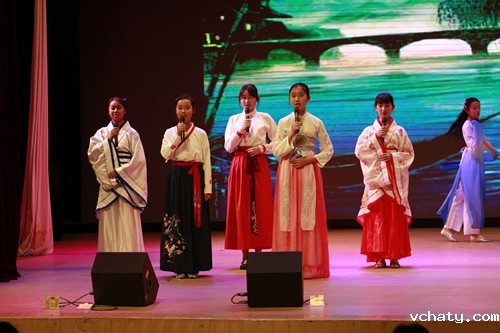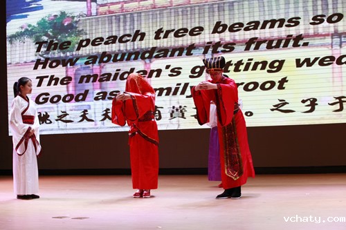 活动主持人包括了来自东西方不同国家的学生,他们分别用中英文反串主持,给观众带来耳目一新的感觉。汇演节目形式多样,既有话剧,小品,歌曲等传统艺术形式,也有歌舞说唱,英文京剧等创新形式。汇演伊始,歌曲《这里是中国》壮吾华夏之魂展现民族自信,话剧《十二宫廷侍卫》再展中国古代智慧;京剧《苏三起解》熔铸坚持正义之精神,而《愚公移山》则展现不畏艰难之胆魄;朗诵《桃花源记》吟诵出归隐之美。话剧《诗经》娴静纯美,歌曲《青花瓷》悠然静远;话剧《中国传统节日》热烈纯真,歌舞《水调歌头》吟锁离愁。由13班同学出演的京剧《霸王别姬》以京剧与英文结合,构思大胆,让同学们领略到京剧梅派艺术与英语结合的那一抹惊艳。