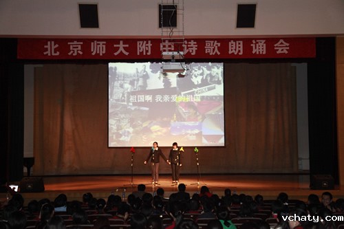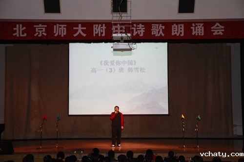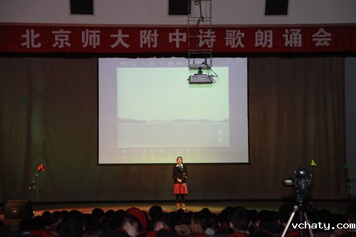高一(4)班的王诗雨、郑慧、郭为嘉、王子豪朗诵《相信未来》,开启了新诗朗诵会的第一章。随着高一(6)班秦伟臻同学“那就从我的血肉之躯上/去取得/你的富饶、你的荣光、你的自由”的朗诵声渐渐高昂,会场的气氛也渐渐热烈。同学们的朗诵声一波一波地从舞台上传出回荡在礼堂中,,每个字符、每个韵脚都传递出同一个声音――我爱你,中国!