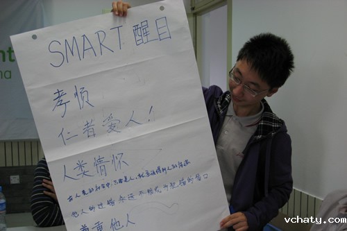 在同学们纷纷对发表了自己的感想后,志愿者们又讲述了一系列蕴含道德深意的社会故事,提出在面对两难处境的情况下究竟应该怎样妥善处理才符合正确的道德标准的问题,同学们进行了激烈的讨论。在同学们的热情越发高涨起来时,志愿者们将当天的活动主题抛出:请同学们分组讨论他们各自最为推崇的生活准则,并进行总结分享展示。五组同学分别从“百善孝先”、“弃恶扬善”、“诚爱勤勇”、“好好活着”、“人类情怀”等几方面立意进行了准则的分享。