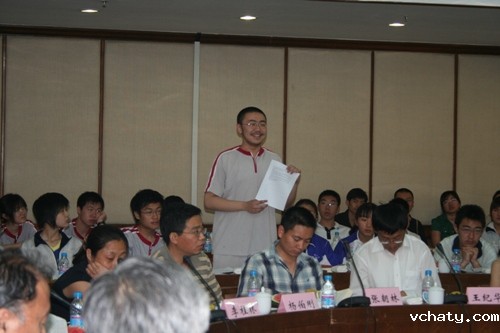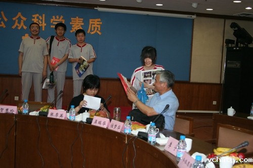 在会上,老科学家们针对我国科普工作的现状及紧迫性,依次发表了精辟的见解。当老科学家们的发言刚刚告一段落,此时会场上发生了一件出乎人们预料的事情,我校学生王英骁举手示意主持人要求发言,主持人临时修改议程,破例同意他发言。王英骁就我国科普工作的发展落落大方地谈出了自己的想法和建议。他讲到,现在许多中学生都在追星,那是因为现在的媒体中到处都充斥着这方面的信息,而要追求科学知识或科学家的故事却很难寻。希望我国的各个部门能够注意到这点,充分利用现代传播媒介来拓宽青少年获取科学知识的途径,像于丹可以在百家讲堂中把论语讲给大众,科普宣传也应该利用这些传统的平面和电视媒体平台来宣传科普知识。另外,希望像清华大学等一些高等学府能开放自己的实验室,让高中生在中学时代就能开展自己的研究,培养科学的兴趣。还可以将科学家们的讲座、报告做成光盘,利用互联网的快捷方便优势等许多途径广泛传播科学知识、科学家的故事,使大众有更多的途径了解科学知识,使青少年从盲目追星中摆脱出来,从而热爱科学、尊重科学,提高全民族的科学素养。……。他还讲到,在寒假中他曾给比尔?盖茨写过一封信,比尔?盖茨及时地回了信,希望他能珍惜高中和大学的各种科学手段学习最多的知识。比尔?盖茨的回信给了他极大的鼓舞,也使他更加热爱学习,如果我们的科学家也能这样,与我国广大的青少年之间建立一条通畅的纽带,使青少年能够与科学家之间保持密切的联系,那对于我国科学技术的发展将是非常重要的。他的发言得到了与会人员的热烈掌声,给各位科学家和与会记者留下深刻印象。