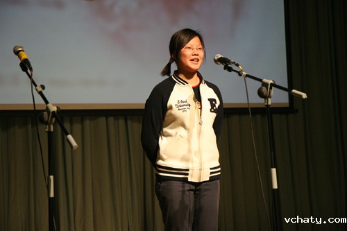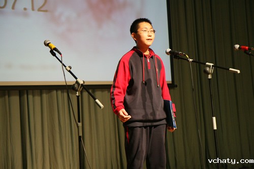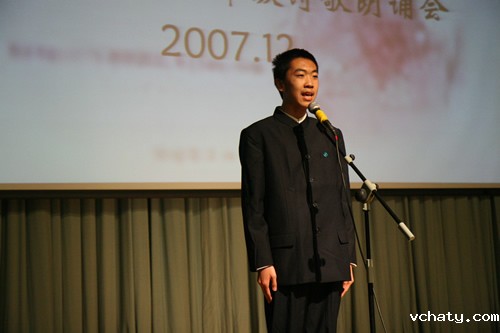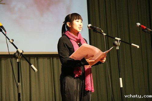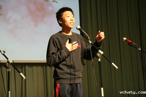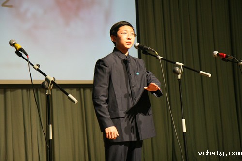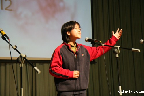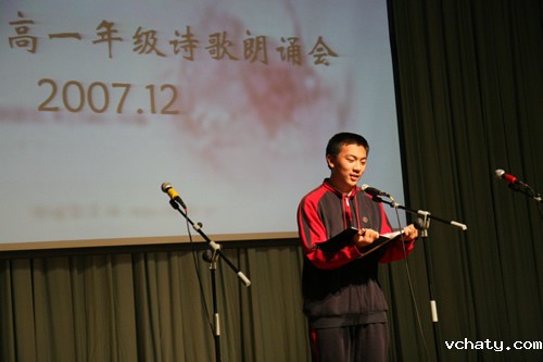 下午三点,朗诵会在洋溢着浓烈青春气息的师大附中校歌声中拉开序幕。一年级各班遴选出的三十多位朗诵高手顺序出场竞技,气氛十分热烈。同学们有的朗诵普希金、泰戈尔等世界著名诗人的名作,有的朗诵徐志摩、舒婷、席慕容等中国作家的佳作,或慷慨及昂,或徐迂舒缓,或委婉细腻,或豪迈奔放,不时引起阵阵热烈的掌声。一(10)班陈纳川同学朗诵余光中的《乡愁》,抑扬有致,声情并茂,赢得比赛最高分;一(2)班丁雨蒙同学朗诵毛泽东的词《沁园春?雪》,感情充沛,技艺精湛,给观众留下了十分深刻的印象。