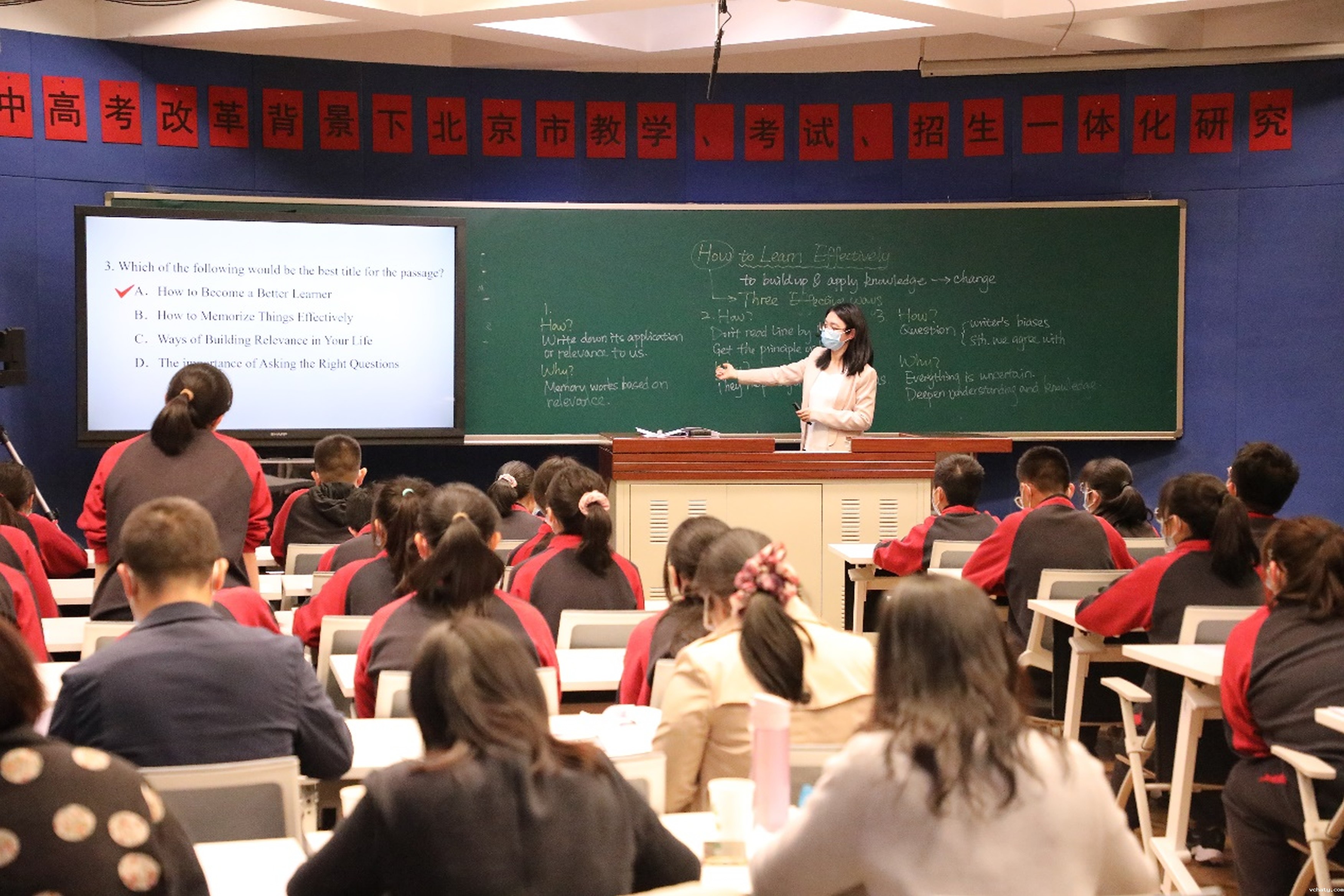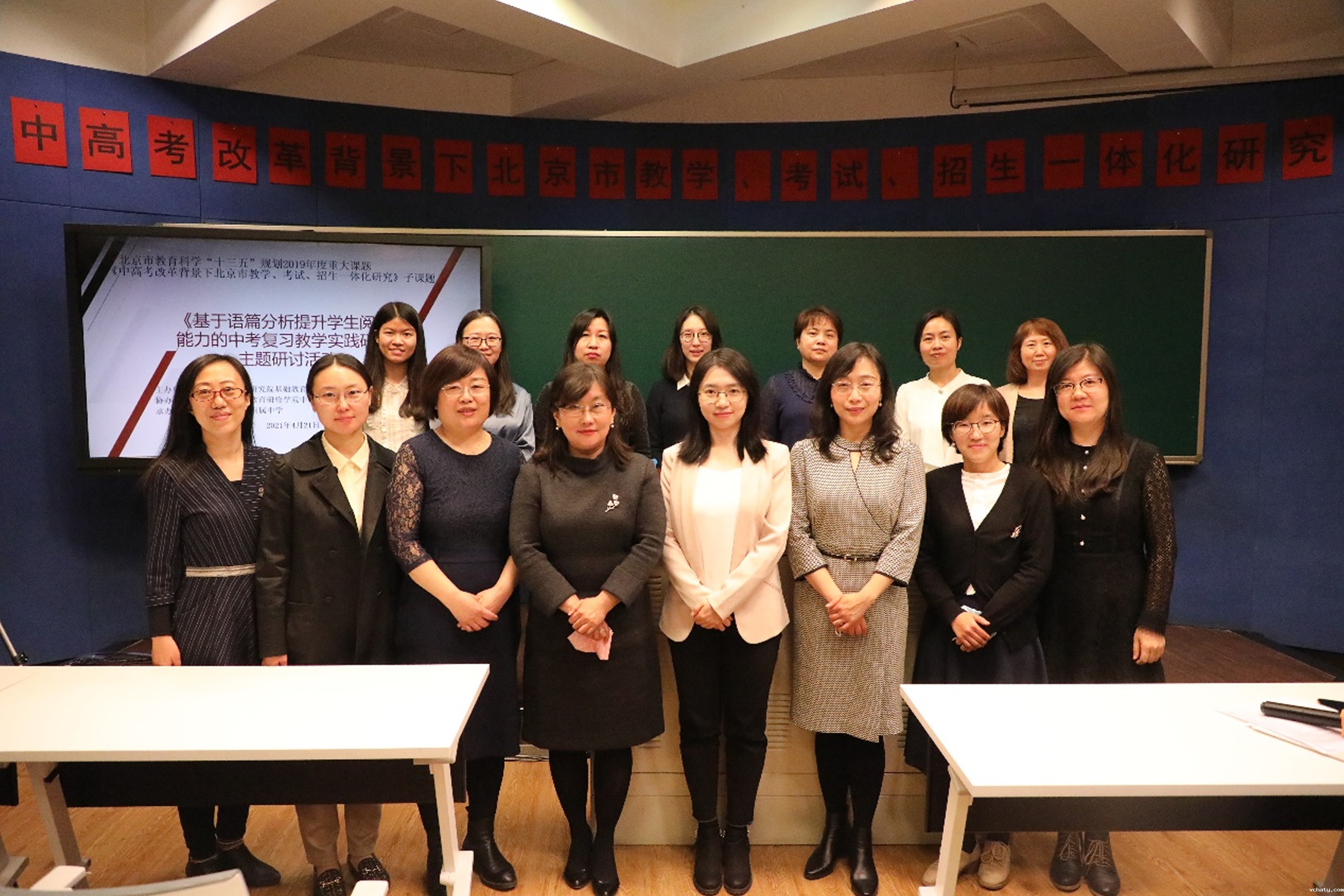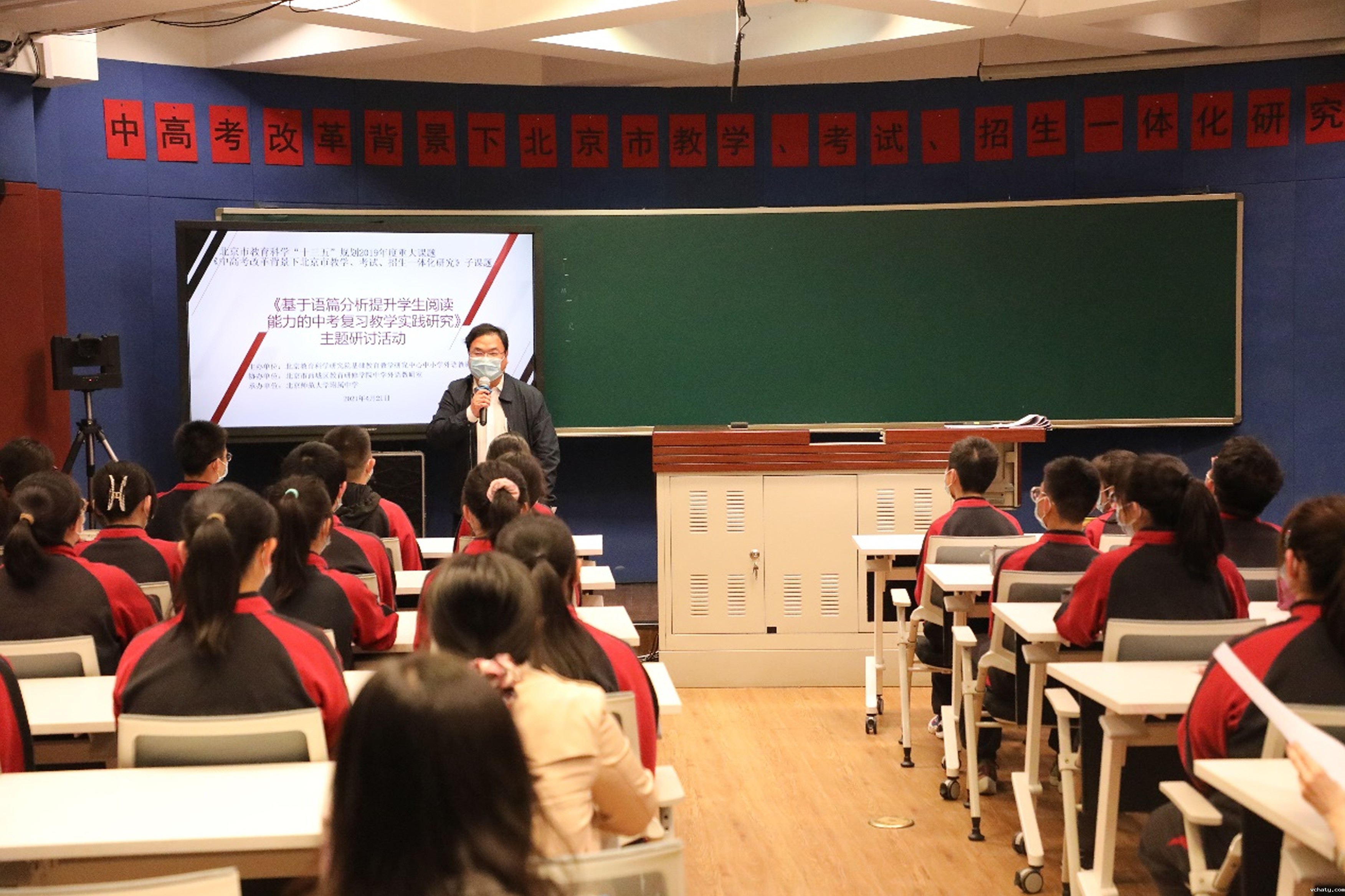 2021年4月21日,为了进一步研究提高初中英语教学的科学性和实效性,北京市基础教育教研中心外语教研室联合西城分院外语教研室,在我校举行了“基于语篇分析提升学生阅读能力的中考复习教学实践研究”主题研讨活动。本活动是北京市教育科学“十三五”规划2019年度重大课题《中高考改革背景下北京市教学考试招生一体化研究》的子课题主题研讨活动。来自北京各区的教研员及我校初三英语教师50人参加了本次活动。基教研中心英语学科教研员、中小学外语教研室主任蒋京丽,基教研中心英语学科教研员何煜,西城区教育研修学院教研员张继红、刘恒,校长助理冯健、教学处副主任张鹏出席了活动。刘蔚岚老师主持了本次活动。本次活动还采用云直播,为不能亲临会场参加研讨的老师提供了观摩和学习机会。