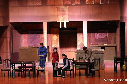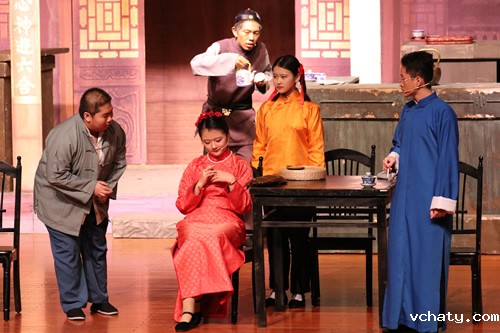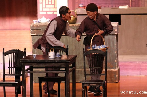 《茶馆》是现代文学家老舍于1956年创作的话剧。剧作展示了戊戌变法、军阀混战和新中国成立前夕三个时代近半个世纪的社会风云变化。通过一个叫裕泰的茶馆揭示了近半个世纪中国社会的黑暗腐败、光怪陆离,以及在这个社会中的芸芸众生。而我校演出的第三幕将老舍先生的原著中的王掌柜上吊自杀的结局改编为开放式,也体现出了我校师生对文学作品的把握能力。