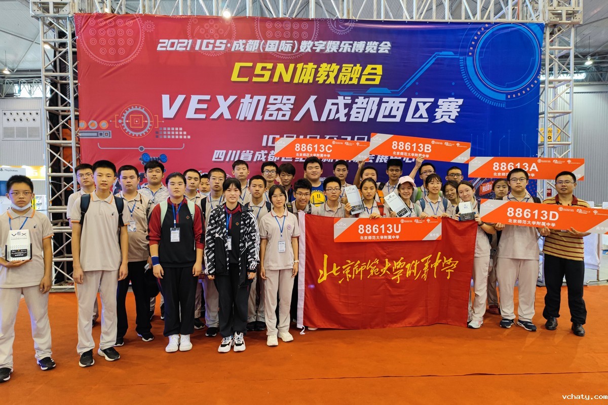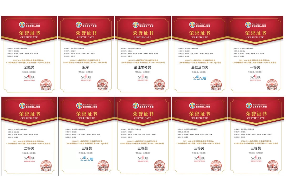 2021年10月1至3日, “ 2021IGS.成都(国际)数字娱乐博会 – CSN体教融合-VEX机器人成都西区赛” 在成都世纪城新国际会展中心隆重开赛。此次VEX机器人成都西区赛共有来自12个省市自治区的近200支赛队参加,将近1000名青少年展开为期三天的激烈比拼。我校派出的6支代表队配合默契,经过激烈的角逐,在淘汰赛、联队赛、四分之一决赛、半决赛、决赛中一路过关斩将,最终获得本次分区赛最高奖项“全能奖”和“冠军”等四项大奖,并获得直通2022VEX世界机器人锦标赛的名额。