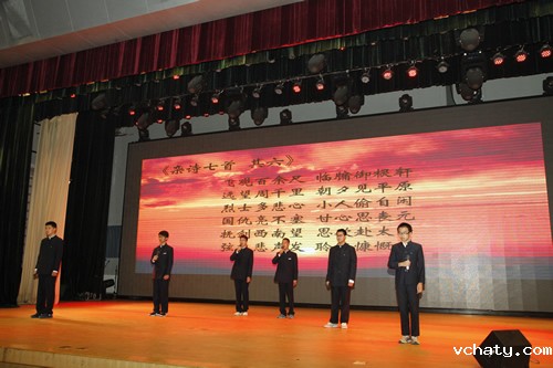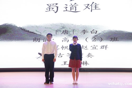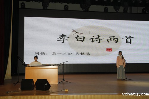 同学们以班级为单位报名,14个节目异彩纷呈。诗词作品纵贯几千年,题材广泛,风格多样,从战国的《诗经秦风》至清朝曹雪芹的《葬花吟》,从唐宋大家的经典名篇到学生的原创作品,中国古典文化的魅力与韵味――或浪漫宏伟、飘逸潇洒,或清扬婉约、孤寂忧愁,在几个小时内得到丰富生动的体现。特别是高一9班、10班的同学们全班上场,用声情并茂、气势磅礴的朗诵真挚地表达出当代青年对祖国传统诗词的理解与热爱。除传统的朗诵外,同学们还融入了歌唱、传统乐器伴奏及舞台剧等形式,多角度展示了中国古典诗词的魅力。最后,梁原草副校长及商雪晴老师登台助兴,朗诵了陆游、唐琬的《钗头凤》,把活动气氛推向高潮。