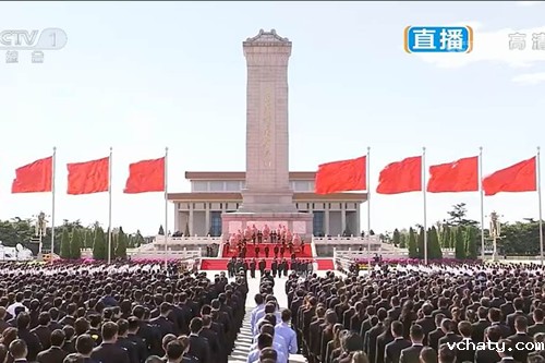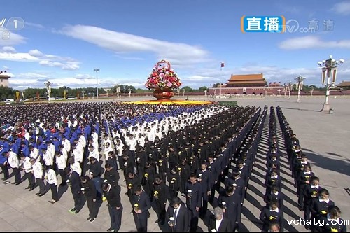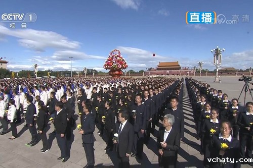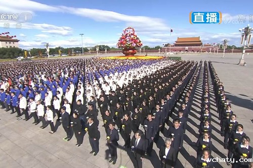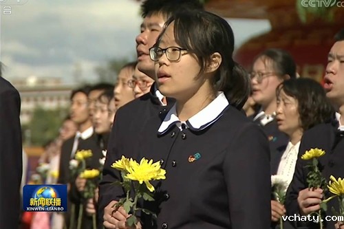 上午十点,敬献花篮仪式开始,附中师生和各界代表满怀激情,共同高唱国歌。国歌唱毕,全场肃立,向为中国人民解放事业和共和国建设事业英勇献身的烈士默哀。在礼兵整齐铿锵的步伐中,在庄严深情的《献花曲》中,党和国家领导人向纪念碑敬献花篮。随着各界纪念人群的队伍,附中师生踏上红毯、手持菊花拾级而上,庄重肃穆地将鲜花敬献在纪念碑白色的基座上,并饱含深情地瞻仰了雄伟庄严的人民英雄纪念碑。