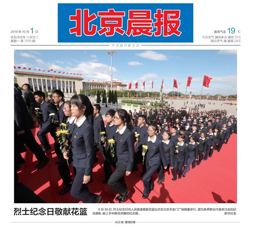9月30日,首都北京秋高气爽,天安门广场庄严肃穆、红旗招展。这是我国第五个烈士纪念日,也是英雄烈士保护法施行后的第一个烈士纪念日。我校146名师生在校党总支许建勇书记和梁原草副校长带领下,作为首都中学代表参加了在天安门广场举行的“向人民英雄敬献花篮仪式”。