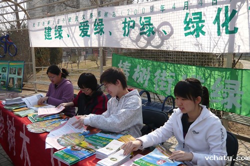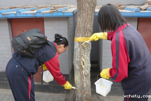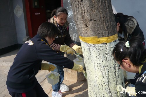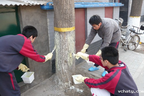 4月4日上午九点,活动在椿树园小区中心花园准时开始。高一、高二近40名志愿者分成两组,一组同学负责在街道所属社区粉刷树木,为树木防虫;一组同学负责发放环保宣传资料并向社区居民宣讲植绿护绿知识。在同学们的共同努力下,百余棵树在两小时内全部刷完,有的同学意犹未尽,还高兴的和自己“护”过的树合影留念。任务的圆满完成得到了社区领导和居民的高度赞扬。