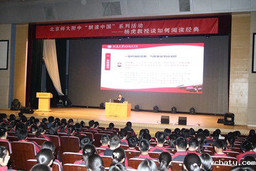 3月25日下午,校学生会举办的“朗读中国 传习经典”系列活动在附中百年会堂举行了别开生面的启动仪式。北京大学继续教育学院副院长、副书记,新闻与传播学院现代出版研究所特聘研究员杨虎老师以其精彩的讲座《经典的选择与阅读之法》为“朗读中国 传习经典”活动拉开帷幕。