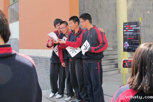 周二、周四班级街头艺人展示。在综合楼前,高二七班的四个男生们带来了十分搞笑的换大米,高一4班模仿马里奥,初二2班带来了吉他弹唱,初一3班表演了相声《卖核桃》,初二8班全班同学集体齐唱西城男孩的歌曲,初二1班的女生们带来多首英文歌曲,初一6班带来了民乐合奏,恰好处在小花园里的花刚刚开放时,别有一番意境。附中校园内一片欢歌笑语,同学们在喜欢的演员身上贴好小红花,为喜欢的演员投票。