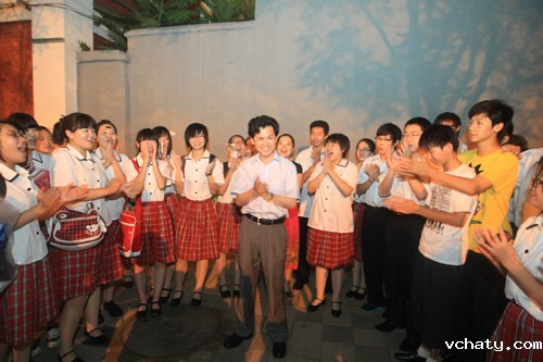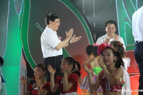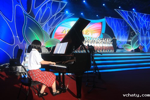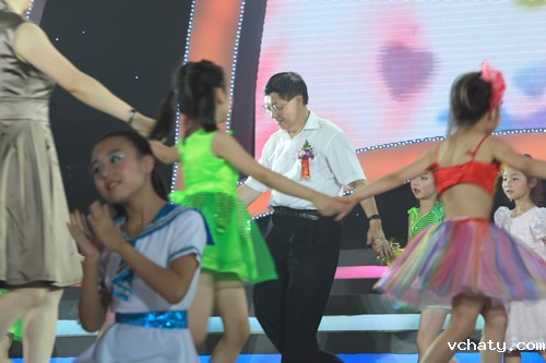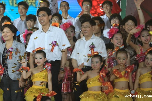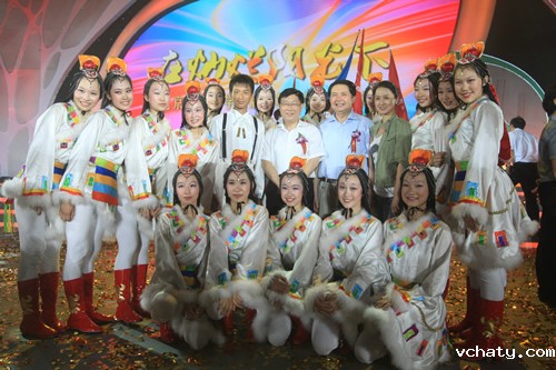 我校初一年级蒿艺源同学参加了晚会的主持。演出结束后,与会领导亲切与参加演出师生合影。